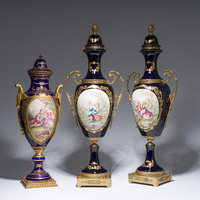 Three French gold layered blue ground gilt bronze mounted Sèvres style vases and covers with gallant scenes, 20th C.