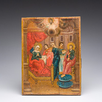A double-sided Russian orthodox icon, 'Three Holy Hierarchs' and 'The betrayal of Jesus Christ by Judas Iscariot', 19th C.