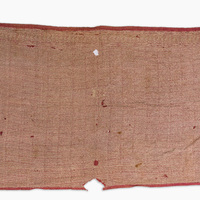This textile is most probably used as a ritual shawl, panel or shoulder cloth. Characteristic of these tribal handwoven fabrics are the tight horizontal stripes, the red (ceremonial), yellow (everyday) and blue-green (tribal) colour blocks, the woven geometric motifs, the rough open side and the use of cotton or local fibres (no silk or pashmina). These fabrics have not only a decorative goal, but always as well a functional and/or ritual one.