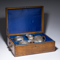 The tapering body with reeded girdle, the hinged domed lit with scroll-shaped thumbpiece. The handle engraved with initials S (over) WF.The bottom engraved with initials M (over) T + S.