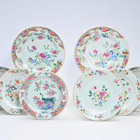 Sept assiettes en porcelaine de Chine famille rose en verte à décor floral et de scènes animées, Yongzheng/Qianlong