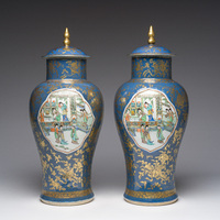 Paire de vases en porcelaine de Chine famille verte sur fond bleu poudré à décor de scènes de palais, 19ème siècle