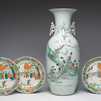 Een paar Chinese famille rose dekselvazen met geanimeerde scènes met onsterfelijken, vrouwen en kinderen, 19de eeuw